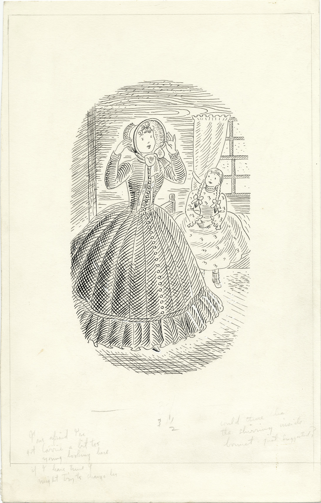 Pen and ink drawing for "These happy golden years" by Laura Ingalls Wilder. Handwritten on front: "I'm afraid I've got Carrie a bit too young looking here. If I have time I might try to change her. Could there be the shirring inside bonnet just suggested?" Stamped and handwritten on back: "From 'These happy golden years.' Please return to Harper & Brothers, Juvenile Dept." Handwritten on back: "No. 7. Carrie sat on bed to watch Laura dress."