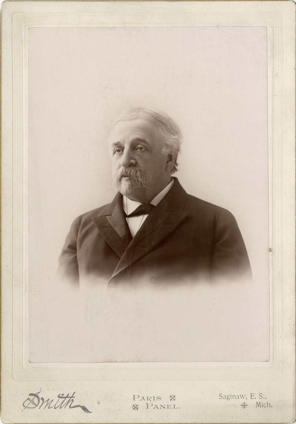 Favorite this☆ Thomas Witherell Palmer Description: Portrait of Thomas Witherell Palmer. Printed on front: "Paris panel. Saginaw, E.S., Mich." Handwritten on front: "Smith." Handwritten on back: "Palmer, Thomas Witherell, 1830-1913." Details Resource ID: bh010354 Creator: Smith, William L. Subject: Palmer, Thomas Witherell, 1830-1913 Photographers--Michigan--Saginaw Cabinet photographs Photographic prints Date Issued: Unknown year Format: 1 cabinet card ; image 7.75 x 5.5 in. Member of: Burton Historical Collection Filing Location: E&M B P1828 Rights: Physical rights are retained by DPL. Copyright is retained in accordance with U.S. copyright laws.