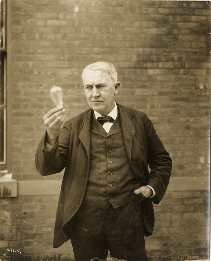 Portrait of Thomas Alva Edison holding an incandescent lightbulb. Stamped on back: "Photo by N. Lazarnick. When publishing this picture kindly print above credit line beneath each reproduction. Notice - to protect our clients written permission must be obtained from the office of the Photoworld Service, 1440 Broadway, New York, if this photo is to be used for advertising or trade purposes. Not to be syndicated, rented or loaned without permission." Handwritten on back: "Edison, Thomas Alva, 1847-1931. Thos. Edison & his incandescent elect. lamp."