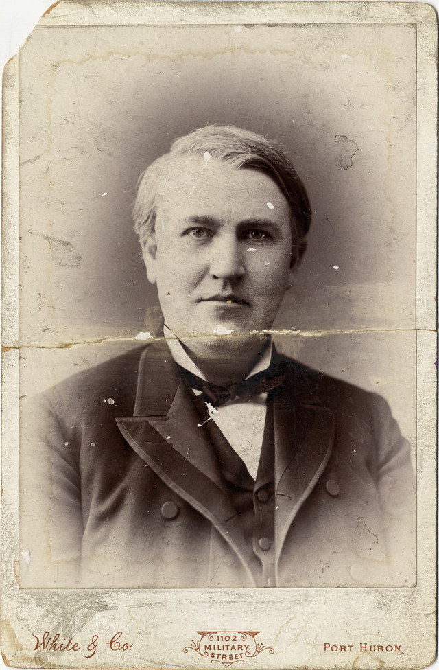 Favorite this☆ Thomas A. Edison Description: Portrait of inventor Thomas Alva Edison. Printed on front: "White & Co., 1102 Military Street, Port Huron. Printed on back: "J.M. White & Co., photographers. 1102 Military Street, Port Huron, Mich." Includes an image of the exterior of the building. Details Resource ID: bh010360 Creator: White, James M. Subject: Edison, Thomas A. (Thomas Alva), 1847-1931 Photographers--Michigan--Port Huron Cabinet photographs Photographic prints Format: 1 cabinet card ; image 5.5 x 4 in. Member of: Burton Historical Collection Filing Location: E&M B E2337 Rights: Physical rights are retained by DPL. Copyright is retained in accordance with U.S. copyright laws.