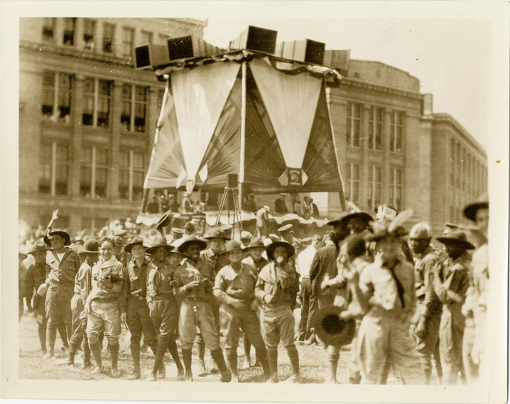 View of a group of Boy Scouts posing during the visit of aviator Charles A. Lindbergh to Detroit, Michigan as part of the 1927 Guggenheim goodwill tour. Platform in background is decorated with bunting and a "Welcome, Lindbergh" sign. The event took place at Northwestern Field. To promote aviation, Lindbergh visited 48 states and 82 cities during a three-month period. Handwritten on back: "Lindbergh, Charles A. Visit to Detroit, 1927. Northwestern Field, Aug. 10, 1927."
