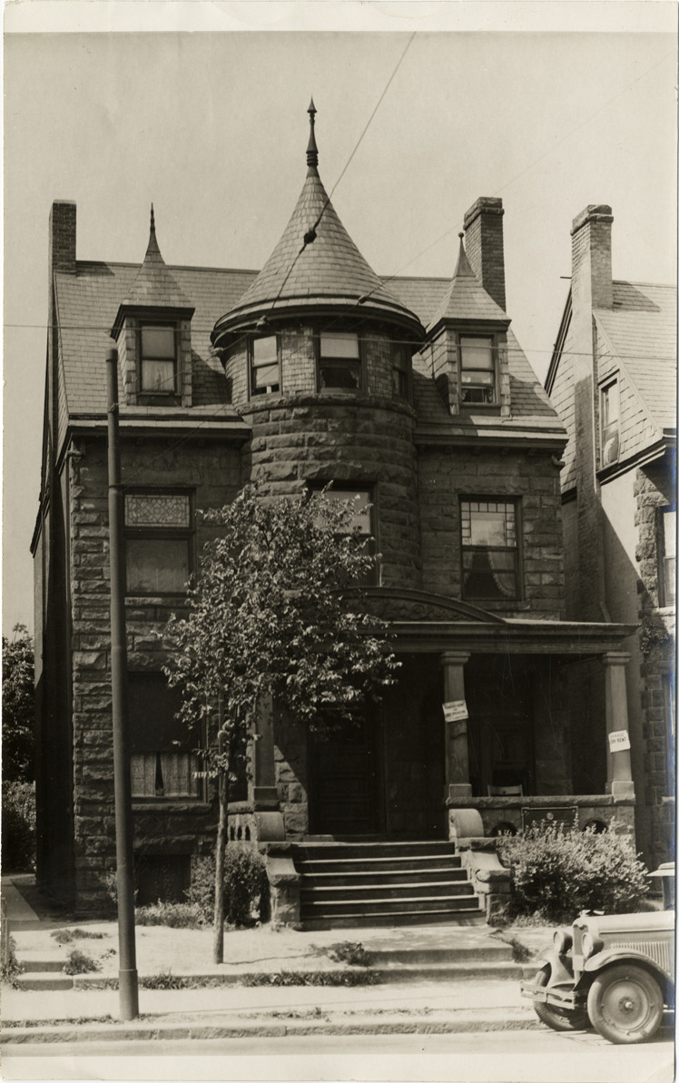 View of the birthplace of aviator Charles A. Lindbergh in Detroit, Michigan, located at 1120 W. Forest Avenue. Two-story Richardsonian Romanesque house has turret and covered entry porch. Label on back: "John A. Wiederhold, 3861 Rohns Ave., Detroit, Mich. When Col. Charles A. Lindbergh was born in the above house at 1120 W. Forest Ave., Detroit, the event passed almost unnoticed. Now, however, the entire world is awaiting the arrival of a new Lindberg [sic], heir of the Colonel; amid a different setting."