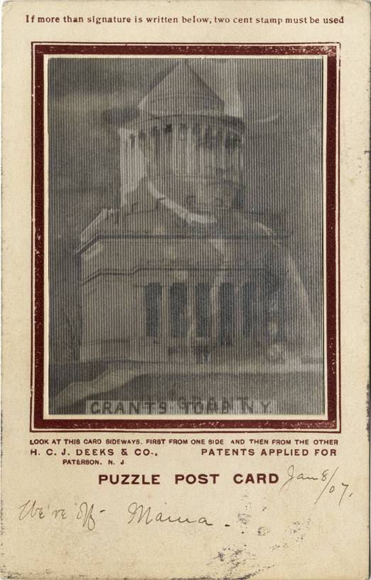 Portrait of General Ulysses S. Grant and view of Grant's Tomb. View changes depending on angle of card. Printed on front: "Look at this card sideways, first from one side and then from the other. H.C.J. Deeks & Co., Paterson, N.J. Patents applied for. Puzzle post card. If more than signature is written below, two cent stamp must be used." Images are identified as "U.S. Grant" and "Grant's Tomb, N.Y." Handwritten on front: "Jan 8/07. We're off, Maura."