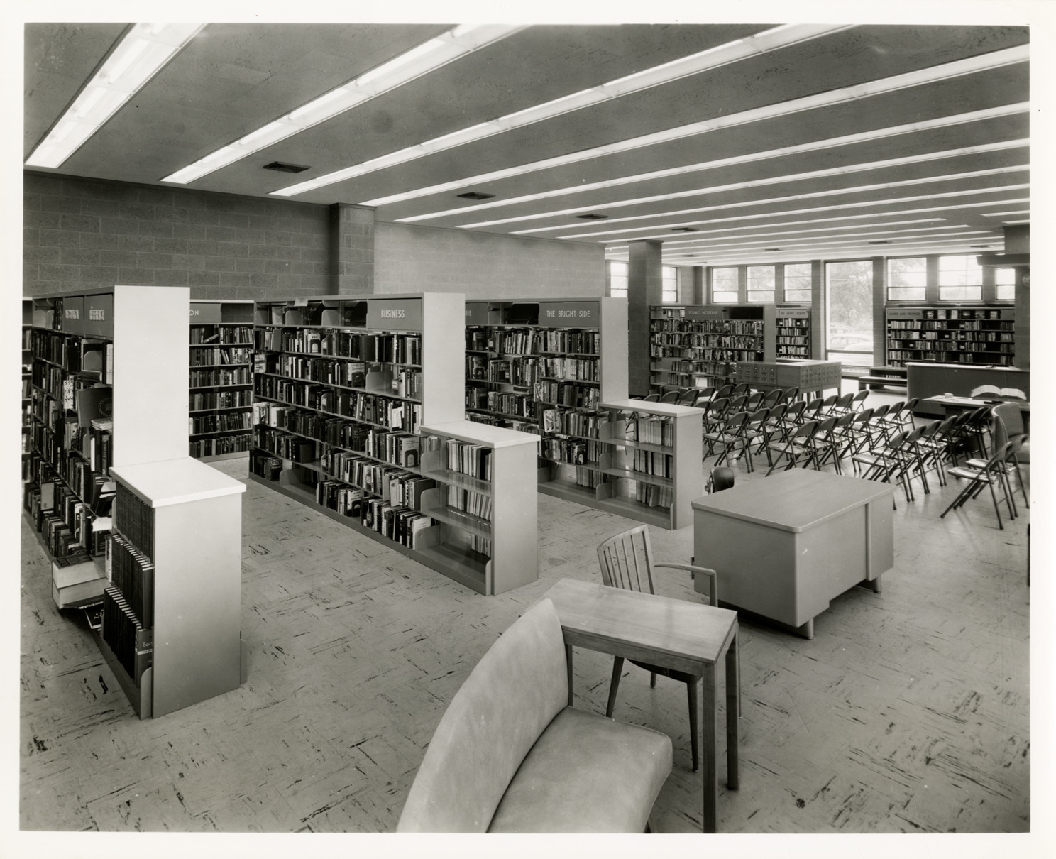 View of the bookshelves in the Chase Branch Library, Detroit Public Library. Desk in foreground; rows of folding chairs in background. Stamped on back: "Photographers Commercial, 15909 Hartwell, VE. 8-8180, Detroit 27, Michigan." Handwritten on back: "Chase Branch, July 1952. View from adult area toward children's area, art metal shelving."