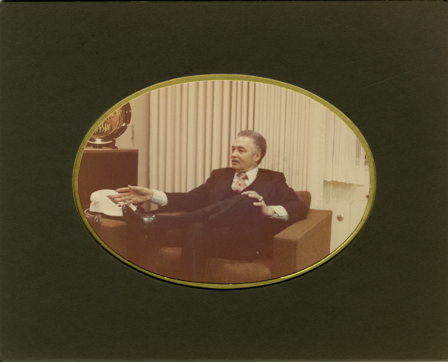 View of Coleman A. Young, in his office, sitting in an armchair.