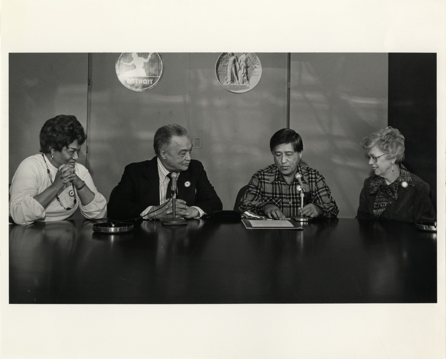 View of Coleman A. Young at conference table with Cesar Chavez and Detroit City Council members Erma Henderson and Maryann Mahaffey. Stamped on back: "City of Detroit photographic."