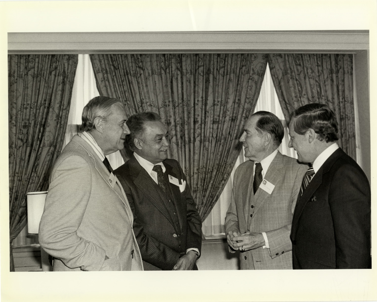 View of Coleman A. Young with Frank Wansbrough, Ralph T. McElvenny and Robert G. Wall at the International Freedom Festival Duck Luncheon, held at the Detroit Club. Label on back: "International Freedom Festival Duck Luncheon, Detroit Club, February 9, 1979. Frank Wansbrough, former mayor Windsor. Coleman A. Young, Mayor of Detroit. Ralph T. McElvenny, Chairman Emeritus, I.F.F. Robert G. Wall, General Chairman 1979."