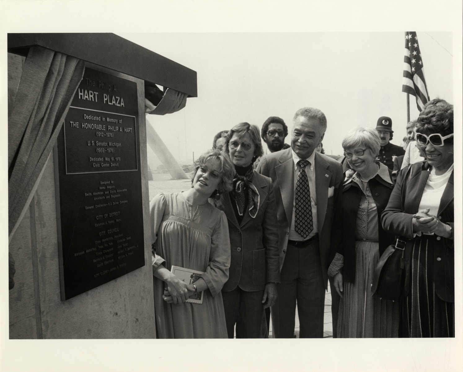 View of Coleman A. Young, Detroit City Council members Erma Henderson and Maryann Mahaffey and others looking at commemorative plaque during the dedication of Hart Plaza. Stamped on back: "City of Detroit photographic."