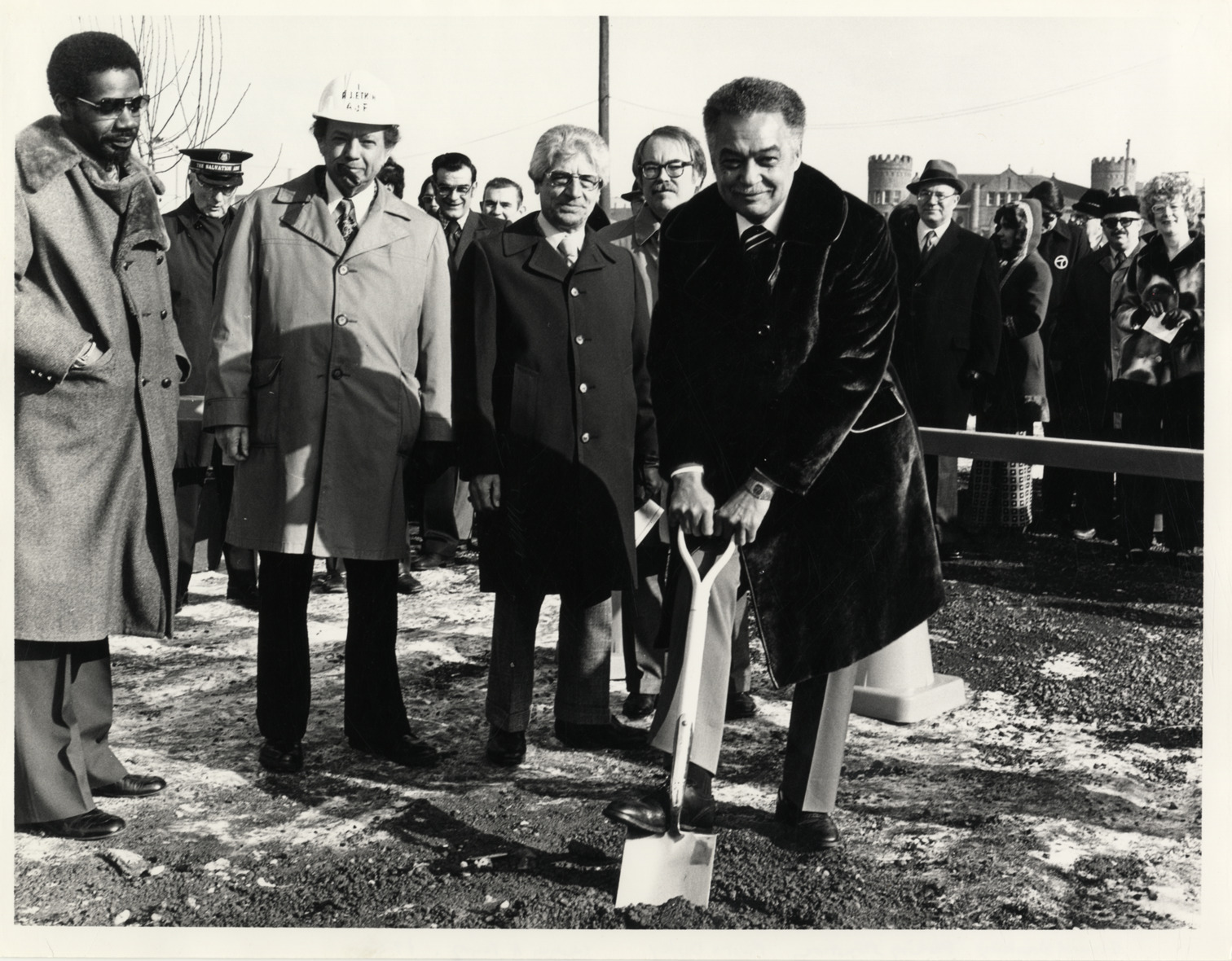 View of Coleman A. Young and others at the groundbreaking ceremony for the parking structure located at First Street and Bagley Avenue in Detroit. Young holds a shovel. Stamped on back: "A.J. Etkin Construction Co., 10111 Capital, Oak Park, Mich. 48237." Handwritten on back: "Groundbreaking, parking structure, First & Bagley. Coleman A. Young, 1975."