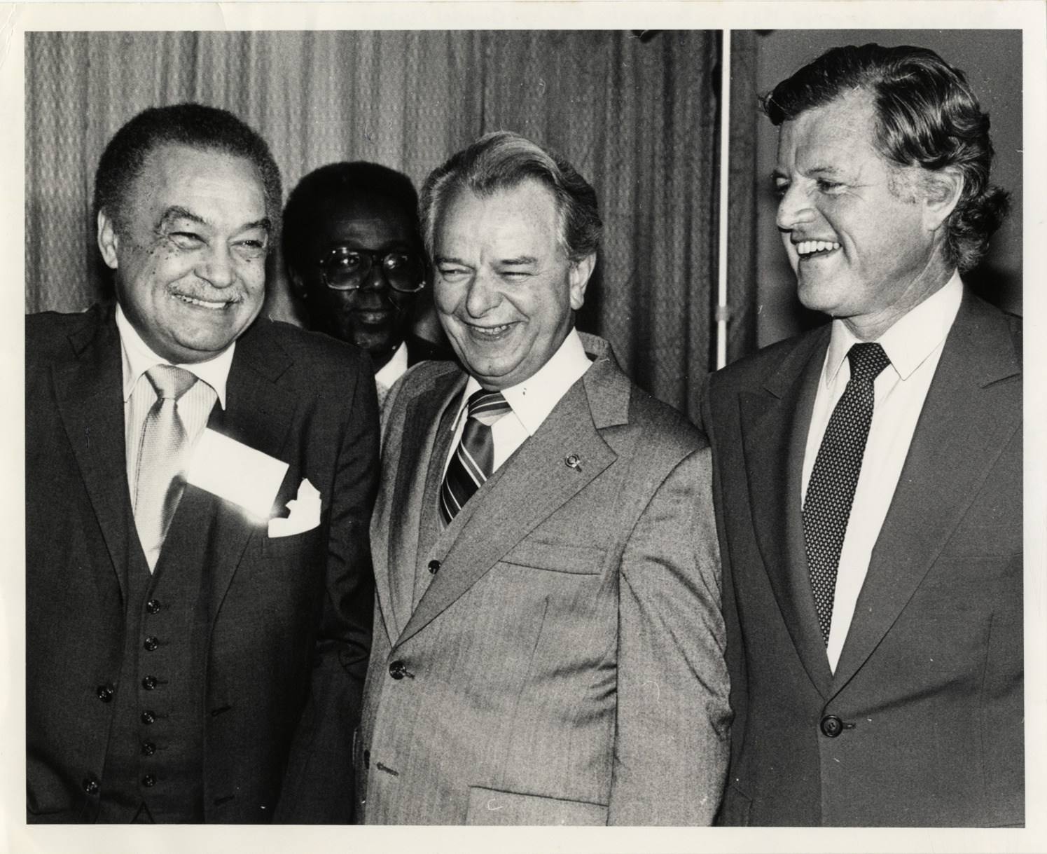 View of Coleman A. Young, Edward Kennedy and Robert C. Byrd at the Democratic Strategy Counsel meeting in Baltimore, Maryland. Handwritten on back: "Baltimore, Oct or Nov 1981. Democratic Strategy Counsel Meeting. Coleman A. Young, Robert Byrd, Edward Kennedy."