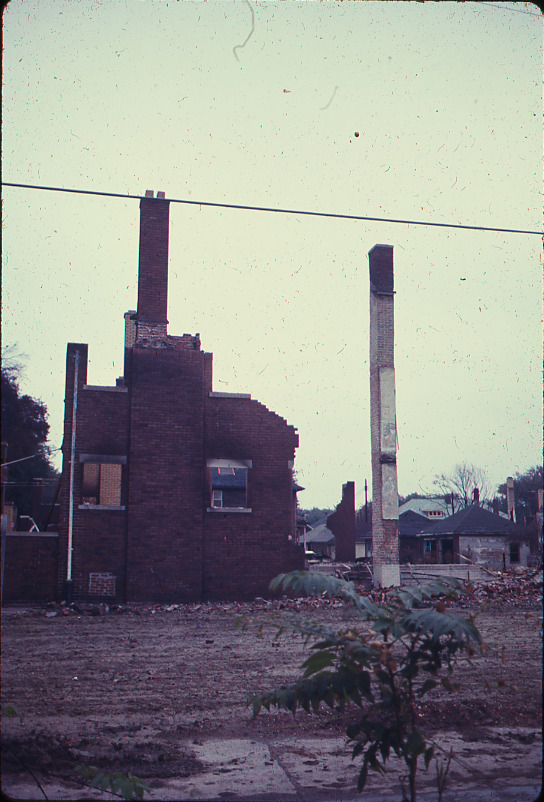 Favorite this☆ Fire-damaged house Description: View of brick house damaged by fire during the 1967 riots in Detroit. Details Resource ID: bh010587 Subject: Brick houses--Fires and fire prevention--Michigan--Detroit Lost architecture--Michigan--Detroit Riots--Michigan--Detroit Slides Date Issued: 1967 Format: 1 slide in cardboard mount : col. ; 2 x 2 in. Member of: Burton Historical Collection Negative Number: Slide no. 1115 Rights: Physical rights are retained by DPL. Copyright is retained in accordance with U.S. copyright laws.