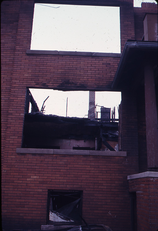 Favorite this☆ Fire-damaged house Description: View of brick house damaged by fire during the 1967 riots in Detroit. Details Resource ID: bh010604 Subject: Brick houses--Fires and fire prevention--Michigan--Detroit Lost architecture--Michigan--Detroit Riots--Michigan--Detroit Slides Date Issued: 1967 Format: 1 slide in cardboard mount : col. ; 2 x 2 in. Member of: Burton Historical Collection Negative Number: Slide no. 1132 Rights: Physical rights are retained by DPL. Copyright is retained in accordance with U.S. copyright laws.