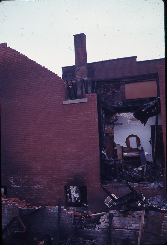 Favorite this☆ Fire-damaged house Description: View of a brick house damaged by fire during the 1967 riots in Detroit. Details Resource ID: bh010607 Subject: Brick houses--Fires and fire prevention--Michigan--Detroit Lost architecture--Michigan--Detroit Riots--Michigan--Detroit Slides Date Issued: 1967 Format: 1 slide in cardboard mount : col. ; 2 x 2 in. Member of: Burton Historical Collection Negative Number: Slide no. 1135 Rights: Physical rights are retained by DPL. Copyright is retained in accordance with U.S. copyright laws.