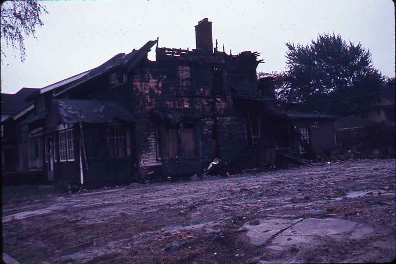View of a wooden-frame house damaged by fire during the 1967 riots in Detroit.