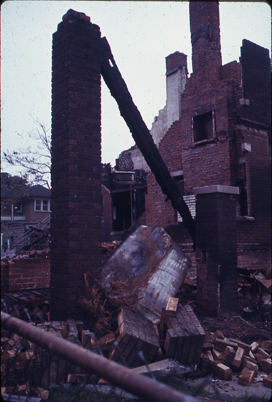 View of a brick house damaged by fire during the 1967 riots in Detroit.