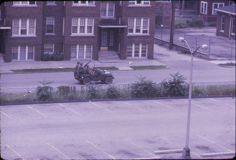 Favorite this☆ National Guard in jeep traveling on Byron Street Description: View of National Guardsmen traveling in military jeep on Byron St. during the 1967 riots in Detroit. Parking lot of Herman Kiefer Hospital, the site of the Kiefer Command Post, in foreground. Handwritten on mount: "Byron St., HKH parking lot." Details Resource ID: bh010635 Subject: Jeep automobile Michigan. National Guard Streets--Michigan--Detroit Riots--Michigan--Detroit Slides Date Issued: 1967 Format: 1 slide in cardboard mount : col. ; 2 x 2 in. Member of: Burton Historical Collection Negative Number: Slide no. 1564 Rights: Physical rights are retained by DPL. Copyright is retained in accordance with U.S. copyright laws.