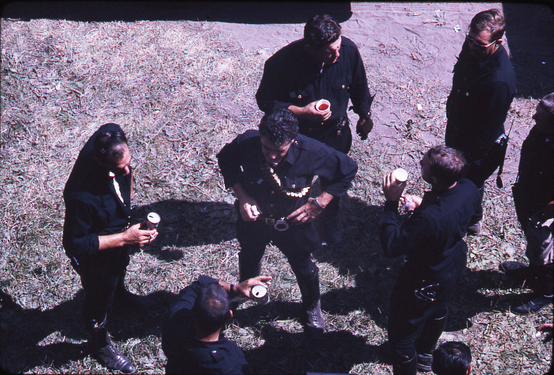 Overhead view of Detroit Police officers drinking beverages at the Kiefer Command Post on the grounds of Herman Kiefer Hospital during the 1967 riots in Detroit. Handwritten on mount: "HKH, Kiefer Command Post."