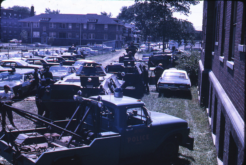 Tank and police vehicles, Kiefer Command Post Description: View of a tank, Detroit Police tow truck and squad cars at the Kiefer Command Post on the grounds of Herman Kiefer Hospital during the 1967 riots in Detroit. Handwritten on mount: "HKH, Kiefer Command Post." Details Resource ID: bh010648 Subject: Police vehicles--Michigan--Detroit Tanks (Military science)--Michigan--Detroit Wreckers (Vehicles)--Michigan--Detroit Riots--Michigan--Detroit Slides Date Issued: 1967 Format: 1 slide in cardboard mount : col. ; 2 x 2 in. Member of: Burton Historical Collection Negative Number: Slide no. 1577 Rights: Physical rights are retained by DPL. Copyright is retained in accordance with U.S. copyright laws.