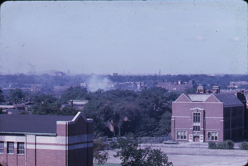 View of the Kiefer Command Post on the grounds of Herman Kiefer Hospital during the 1967 riots in Detroit. Smoke in background. Handwritten on mount: "HKH, Kiefer Command Post."