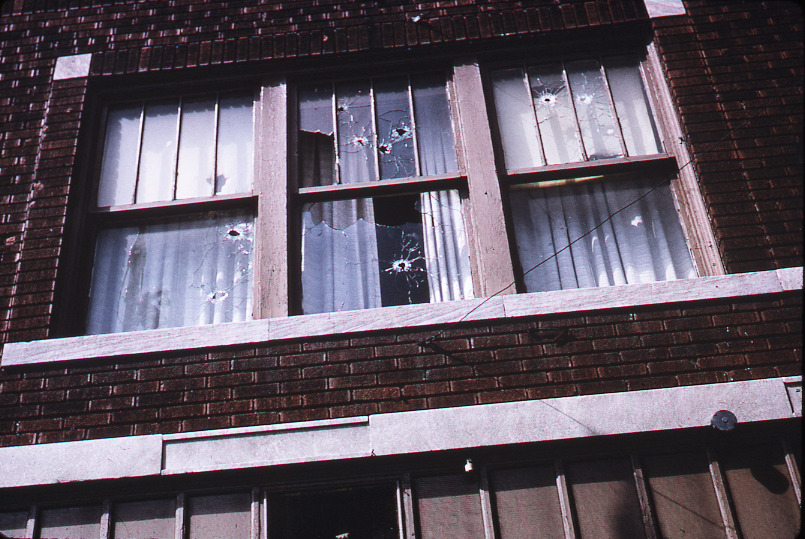Favorite this☆ Bullet holes in building windows Description: View of windows on brick building damaged by bullet holes during the 1967 riots in Detroit. Details Resource ID: bh010665 Subject: Buildings--Michigan--Detroit Windows--Michigan--Detroit Riots--Michigan--Detroit Slides Date Issued: 1967 Format: 1 slide in cardboard mount : col. ; 2 x 2 in. Member of: Burton Historical Collection Negative Number: Slide no. 1596 Rights: Physical rights are retained by DPL. Copyright is retained in accordance with U.S. copyright laws.