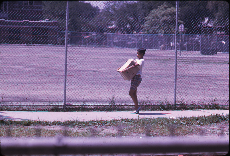 Favorite this☆ Young woman carrying box of emergency food Description: View of a young woman carrying a box of emergency food during the 1967 riots in Detroit. Chain link fence in background. Handwritten on mount: "Food distribution." Details Resource ID: bh010678 Subject: African American women--Michigan--Detroit Emergency food supply--Michigan--Detroit Riots--Michigan--Detroit Slides Date Issued: 1967 Format: 1 slide in cardboard mount : col. ; 2 x 2 in. Member of: Burton Historical Collection Negative Number: Slide no. 1611 Rights: Physical rights are retained by DPL. Copyright is retained in accordance with U.S. copyright laws.