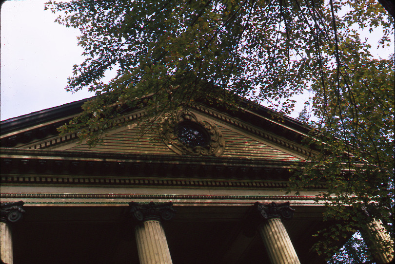 Close-up view of a pediment with roundel or bull's-eye window on a wooden-frame Neoclassical style house located at 724 McDougall. Porch roof is supported by Corinthian columns. Handwritten on mount: "724 McDougall, roof peak, 9-20-64."
