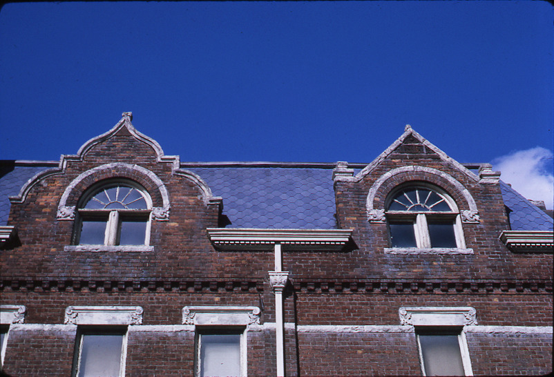 Favorite this☆ Roof dormers, 600 Chene Description: Close-up view of roof dormers with lunettes on a Chateauesque style brick building located at 600 Chene on the corner of Congress. Handwritten on mount: "600 Chene @ Congress, windows, 10-4-64." Details Resource ID: bh010718 Subject: Dormers--Michigan--Detroit Windows--Michigan--Detroit Slides Date Issued: 1964-10-04 Format: 1 slide in cardboard mount : col. ; 2 x 2 in. Member of: Burton Historical Collection Negative Number: Slide no. 187 Rights: Physical rights are retained by DPL. Copyright is retained in accordance with U.S. copyright laws.