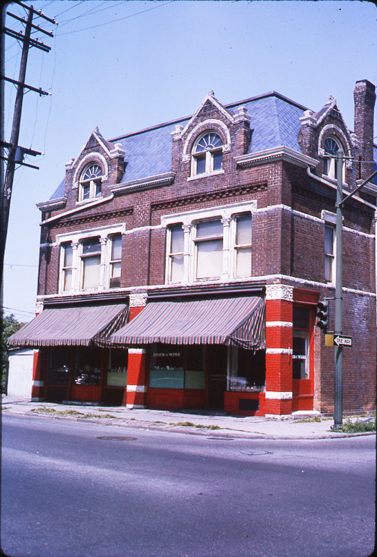 View of a Chateauesque style brick building with storefronts located at 600 Chene at Congress. Building has mansard roof with roof dormers; striped awnings are displayed over storefront windows. Handwritten on mount: "600 Chene @ Congress, N.E. corner, blue roof, beer store, 8-16-64."