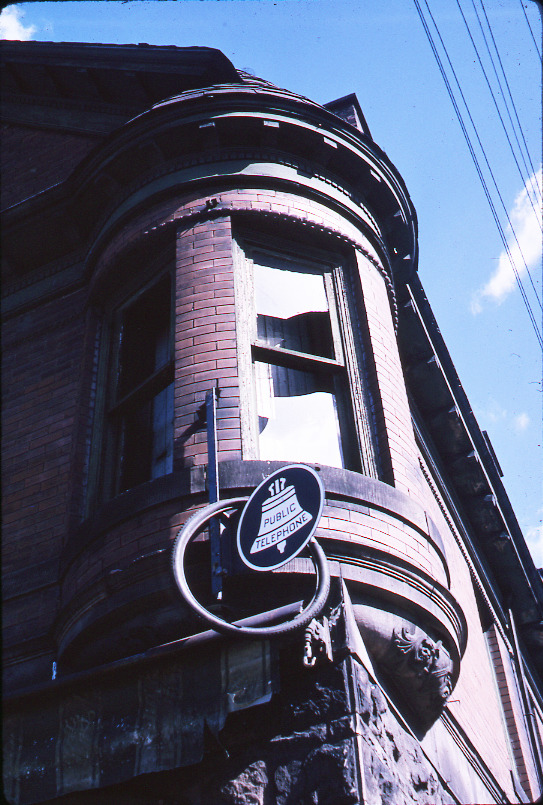 View of an overhanging corner turret with broken windows on a brick commercial building located at the northeast corner of Monroe and Joseph Campau. Handwritten on mount: "Monroe @ Jos. Campau, N.E. corner, carving, 10-4-64."