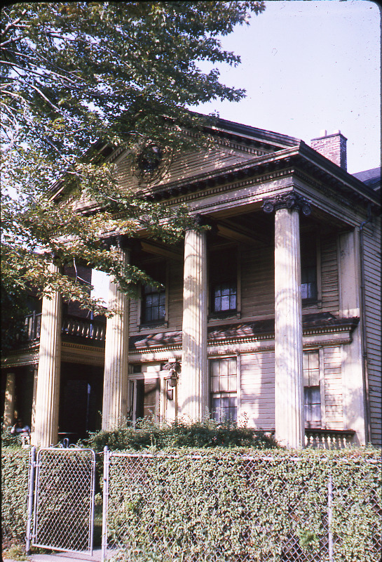View of a two-story, wooden-frame Neoclassical style house located at 724 McDougall. Pediment with roundel is supported by Corinthian columns. Handwritten on mount: "724 McDougall, 8-16-64."