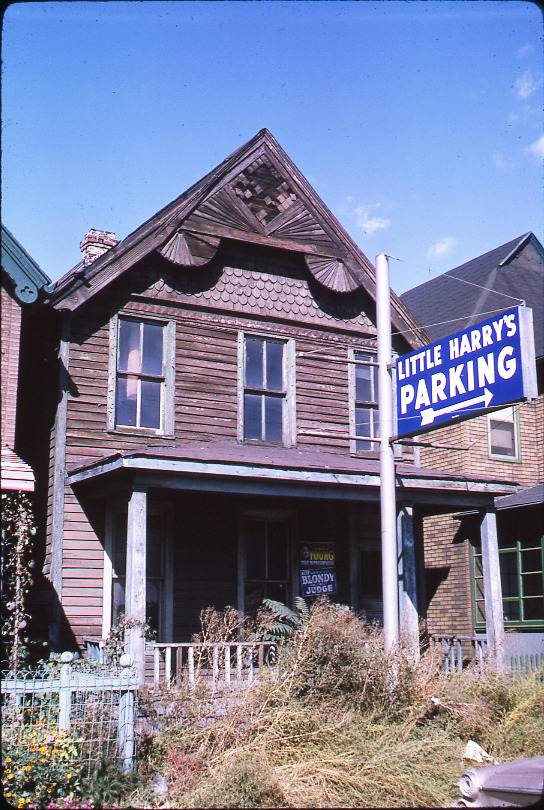Favorite this☆ House at 2673 East Larned Description: View of a two-story, front-gabled wooden-frame Queen Anne style house located at 2673 E. Larned. Political signs posted on facade; sign reading "Little Harry's parking" in foreground. Handwritten on mount: "2673 E. Larned, 10-4-64." Details Resource ID: bh010747 Subject: Wooden-frame houses--Michigan--Detroit Architecture, Queen Anne--Michigan--Detroit Signs and signboards--Michigan--Detroit Slides Date Issued: 1964-10-04 Format: 1 slide in cardboard mount : col. ; 2 x 2 in. Member of: Burton Historical Collection Negative Number: Slide no. 219 Rights: Physical rights are retained by DPL. Copyright is retained in accordance with U.S. copyright laws.
