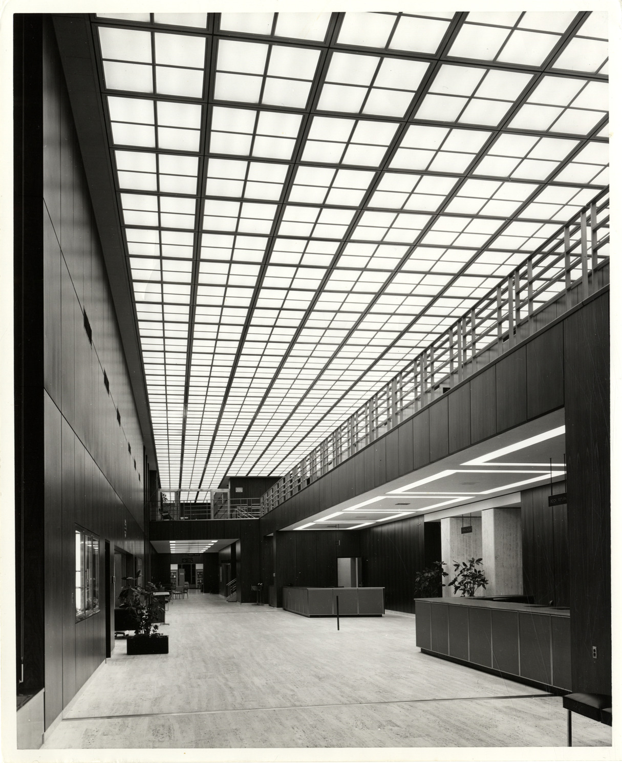 View of the Cass Avenue concourse at the Main Library, Detroit Public Library. Stamped on back: "Lens-Art Photo above credit line necessary on publication (copyright pending). For duplicate photos give no. 8370-18. Lens-Art photographers, 15743 James Couzens Hwy., Detroit 38, UN. 4-5134." Handwritten on back: "Cass concourse."