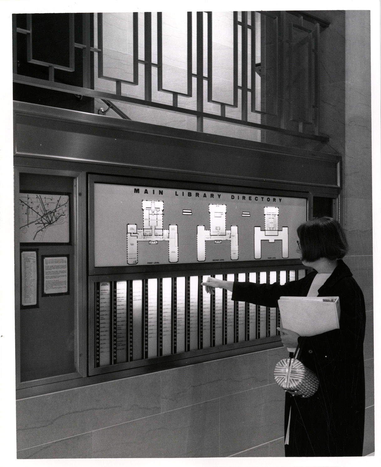 Favorite this☆ Woman using Main Library directory, Detroit Public Library Description: View of a woman, holding a purse and looseleaf binder, pressing a button on the directory for Main Library, Detroit Public Library. Details Resource ID: bh010790 Subject: Detroit Public Library--Maps Detroit Public Library Library buildings--Michigan--Detroit Public libraries--Michigan--Detroit Photographic prints Date Issued: Unknown year Format: 1 photographic print ; 10 x 8 in. Member of: Burton Historical Collection Filing Location: D/Libraries-DPL-Main-Directory Rights: Physical rights are retained by DPL. Copyright is retained in accordance with U.S. copyright laws.