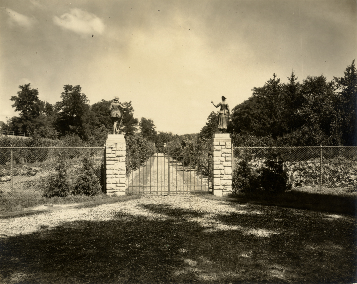 View of the entrance to the vegetable garden on the grounds of Cranbrook in Bloomfield Hills, Michigan. Statues of man and woman decorate gateposts. Garden is surrounded by fence. Label on back: "Vegetable garden."