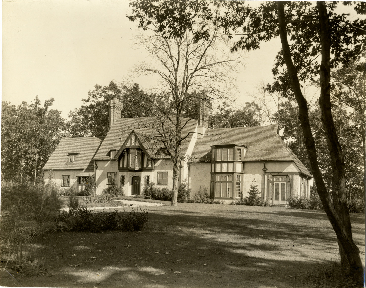 View of the Tudor-style house of A.C. Born in Bloomfield Hills, Michigan, designed by architect J. Ivan Dise. Stamped on back: "Thomas Ellison, photographer of architecture. 3105 Grand Boulevard E., Detroit." Handwritten on back: "A.C. Born res., Bloomfield Hills, Mich. J. Ivan Dise, archt., Detroit. The Architect, 101 Park Ave., Feb. 30."