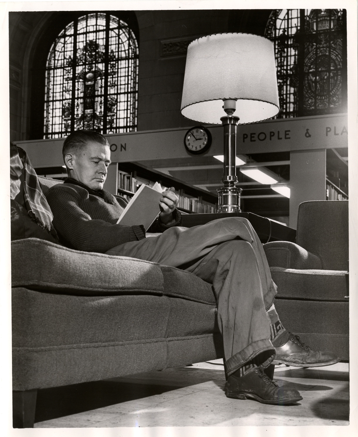 View of Floyd Palmer reading in Adam Strohm Hall, on the third floor of the Main Library, Detroit Public Library. Palmer sits on sofa, next to reading lamp; clock and stained glass windows in background. Handwritten on back: "Floyd Palmer relaxing and reading. Date of photo: 12-13-53."