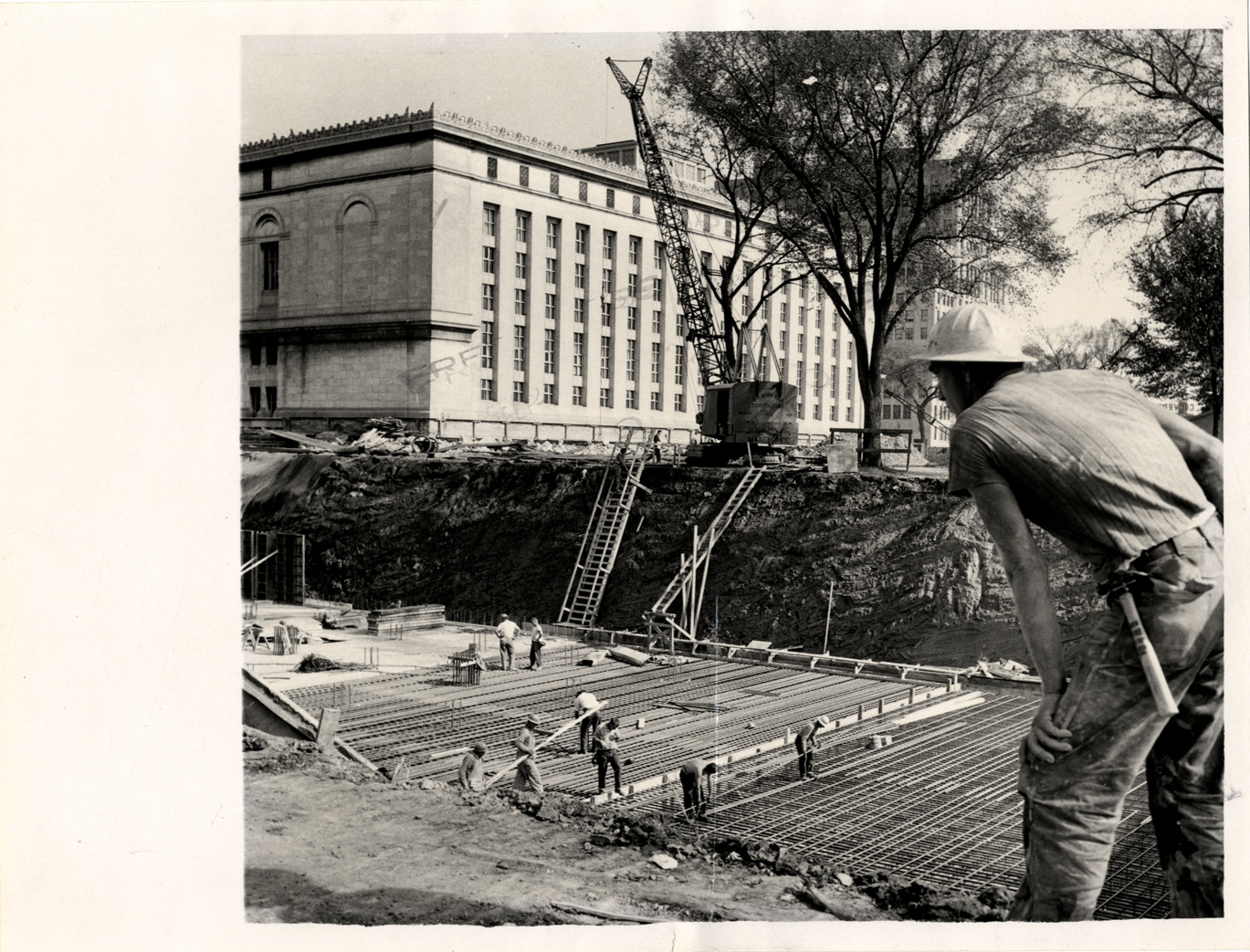 View of Cass Avenue concourse, Main Library, Detroit Public Library during construction. Construction worker in foreground; crane in background. Stamped on back: "Free Press, Sep 23 1958, photo."