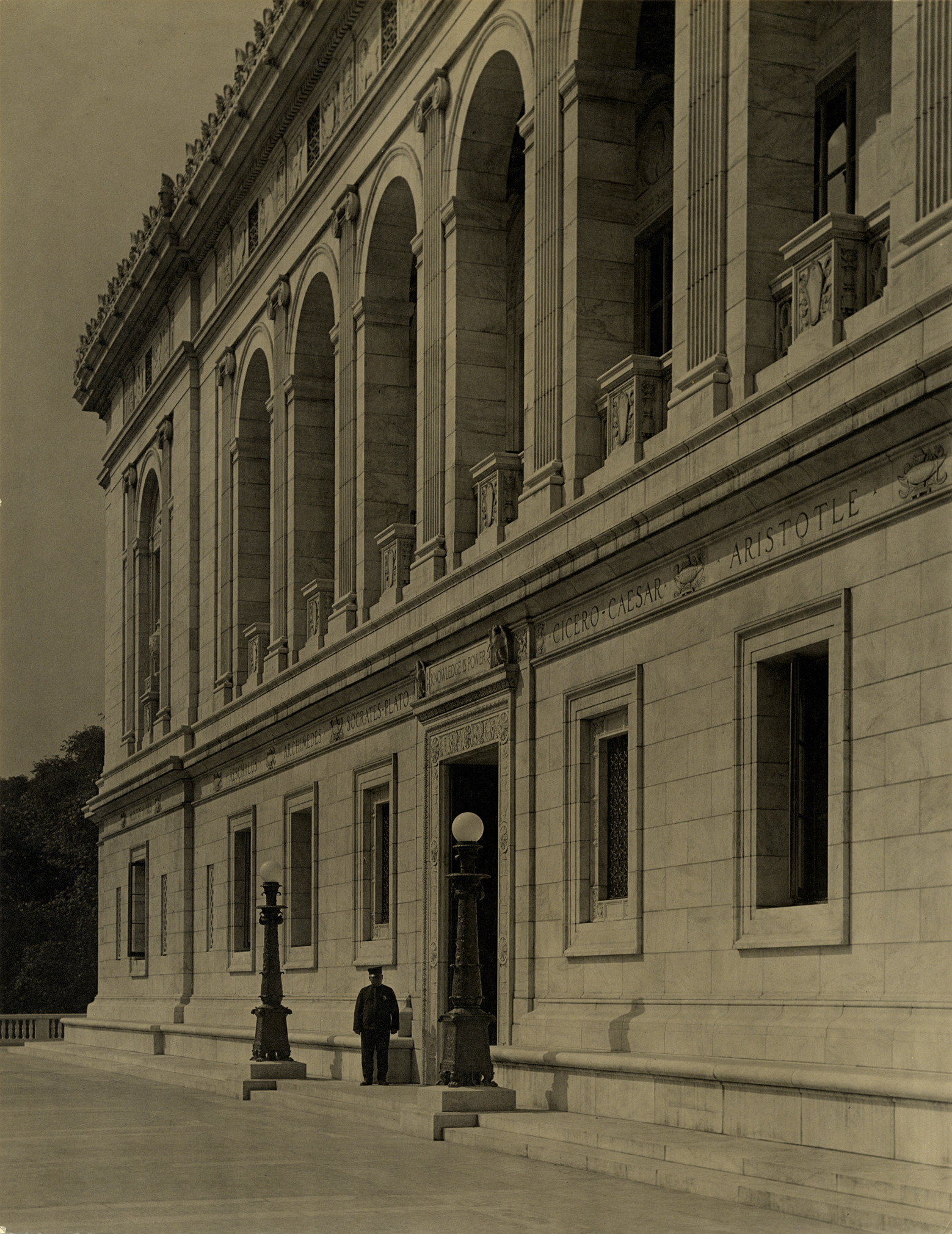 Favorite this☆ Facade, Main Library, Detroit Public Library Description: View of a uniformed man standing in front of the facade and entrance to Main Library, Detroit Public Library. "Knowledge is power" is inscribed over doorway. Details Resource ID: bh010828 Subject: Detroit Public Library Facades--Michigan--Detroit Public libraries--Michigan--Detroit Library buildings--Michigan--Detroit Photographic prints Date Issued: Unknown year Format: 1 photographic print ; 13.5 x 10.5 in. Member of: Burton Historical Collection Filing Location: LD/Libraries-DPL- Main--Facade-Woodward Ave. Rights: Physical rights are retained by DPL. Copyright is retained in accordance with U.S. copyright laws.