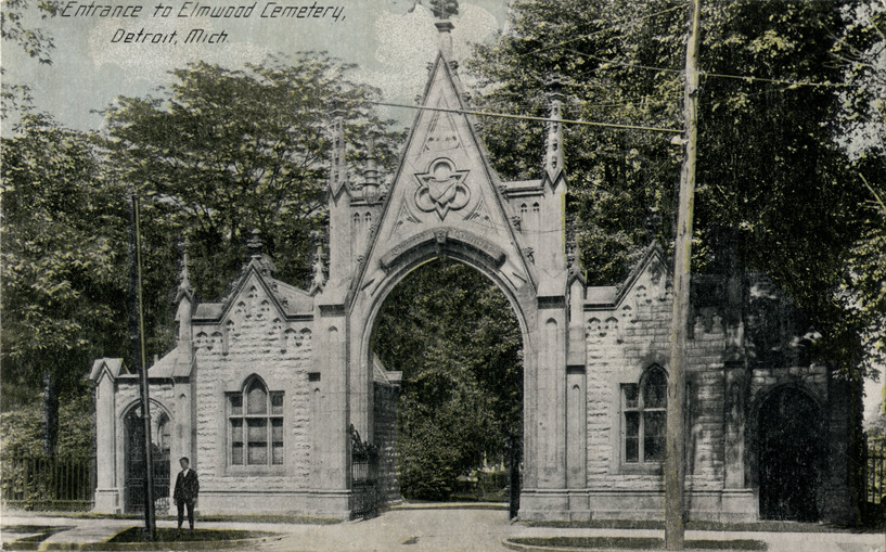 Favorite this☆ Entrance to Elmwood Cemetery Description: View of stone Gothic revival gate leading to Elmwood Cemetery; man stands in front of arched entrance. Printed on front: "Entrance to Elmwood Cemetery, Detroit, Mich." Details Resource ID: bh010832 Subject: Elmwood Cemetery (Detroit, Mich.) Cemeteries--Michigan--Detroit Gates--Michigan--Detroit Postcards Date Issued: Unknown year Format: 1 postcard : col. ; 3.5 x 5.5 in. Member of: Burton Historical Collection Filing Location: D/Cemeteries-Elmwood Rights: Physical rights are retained by DPL. Copyright is retained in accordance with U.S. copyright laws.