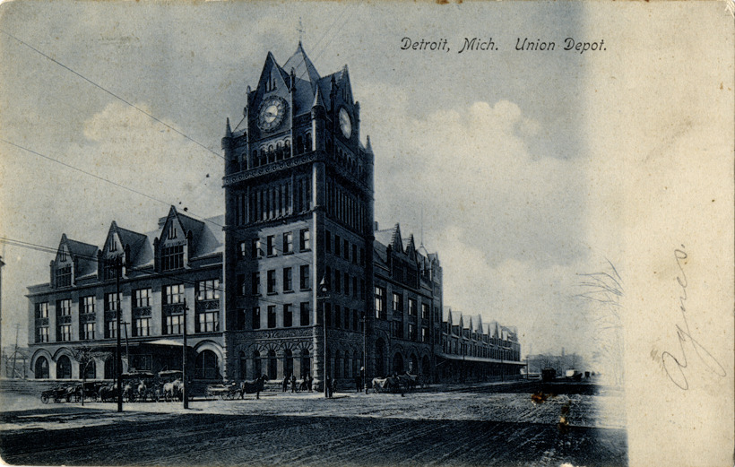 Front and side view of Union Depot; brick Romanesque Revival building has square clock tower on corner. Horse-drawn wagons and carriages in front of station. Printed on front: "Detroit, Mich. Union Depot." Printed on back: "No. 26, A.C. Dietsche, Detroit, Mich. and Leipzig, Germany. Card is postmarked August 8, 1909.