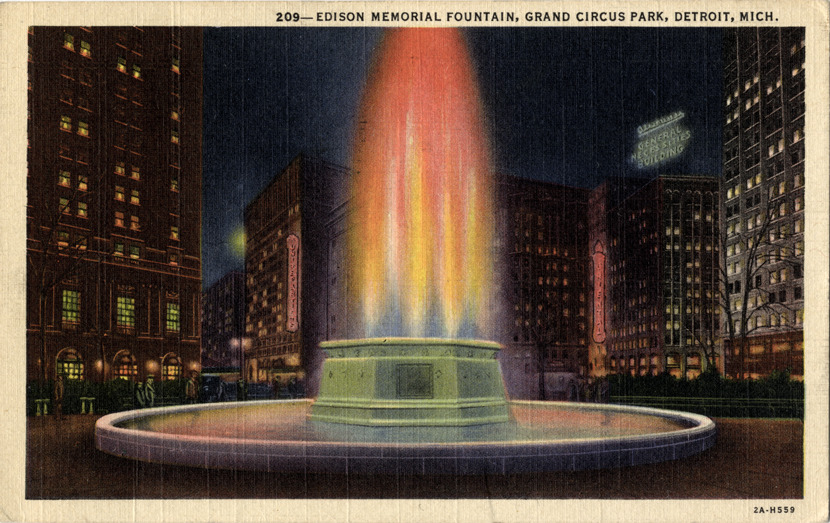 Nighttime view of the Edison Memorial Fountain in Grand Circus Park. Printed on front: "209, Edison Memorial Fountain, Grand Circus Park, Detroit, Mich." Printed on back: "The Edison Memorial Fountain is an impressive tribute to that great man. This fountain is in Grand Circus Park in downtown Detroit. United News Co., 24 West Jefferson Avenue, Detroit, Mich. Genuine Curteich-Chicago 'C.T. Art-Colortone' postcard (reg. U.S. Pat. Off.)" Handwritten on back: "Regards, a lot going at museum convention in Detroit Mich." Card is postmarked June 13, 1947.