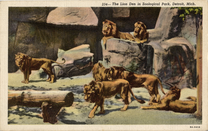 View of lions in den at Detroit Zoo. Printed on front: "234, the lion den in Zoological Park, Detroit, Mich., 8A-H416." Printed on back: "Lion den. The lion den, of man-made rocks, in which full grown lions roam at will behind neither cages nor bars. United News Co., 24 West Jefferson Avenue, Detroit, Mich. Genuine Curteich-Chicago 'C.T. Art-Colortone' post card (reg. U.S. Pat. Off.)"