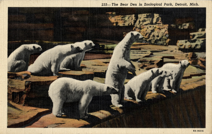 View of polar bears in den at Detroit Zoo. Printed on front: "233, the bear den in Zoological Park, Detroit, Mich., 8A-H415." Printed on back: "Polar bears. In a den of sculptured rocks, splashing and swimming in their giant pool, these beautiful denizens of the Arctic wastes are a continuous source of entertainment. United News Co., 24 West Jefferson Avenue, Detroit, Mich. Genuine Curteich-Chicago 'C.T. Art-Colortone' post card (reg. U.S. Pat. Off.)"