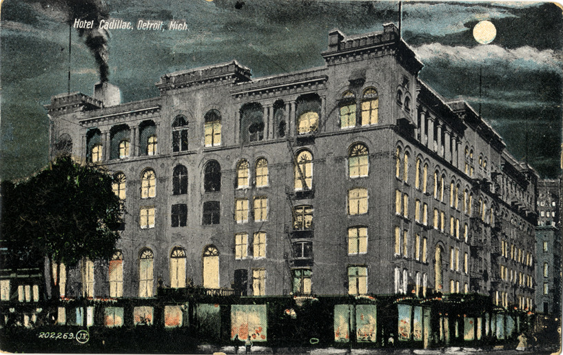 Favorite this☆ Hotel Cadillac at night Description: Nighttime view of the Hotel Cadillac. Printed on front: "Hotel Cadillac, Detroit, Mich." Printed on back: "Published by Wolverine News Co., Detroit, Mich. Printed in Great Britain." Card is postmarked September 22, 1910. Details Resource ID: bh010863 Subject: Hotels--Michigan--Detroit Postcards Date Issued: 1910 (year approximate) Format: 1 postcard : col. ; 3.5 x 5.5 in. Member of: Burton Historical Collection Filing Location: D/Hotels-Cadillac Rights: Physical rights are retained by DPL. Copyright is retained in accordance with U.S. copyright laws.