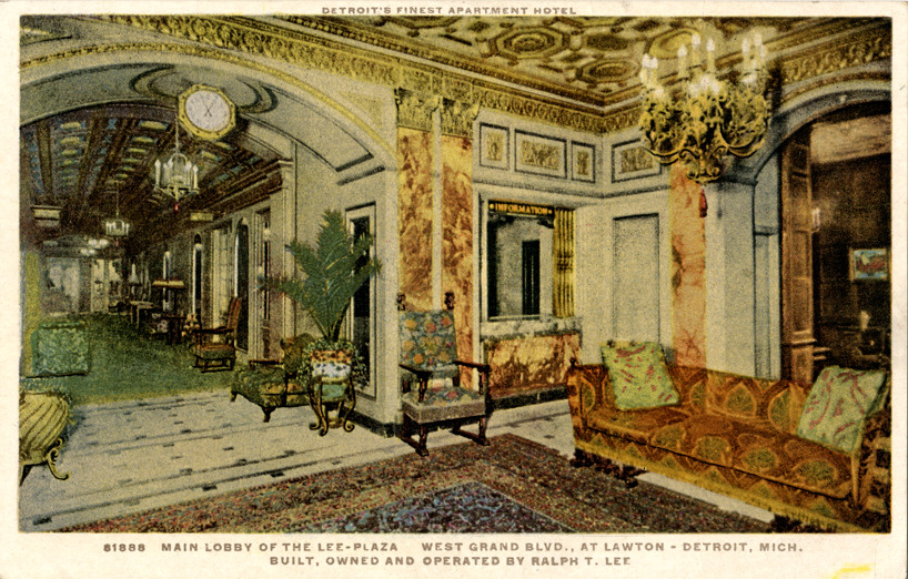 View of the lobby of the Lee-Plaza Hotel. Room is furnished with chairs and sofa; clock and chandeliers are suspended from ceiling. Printed on front: "Detroit's finest apartment hotel. 81888. Main lobby of the Lee-Plaza. West Grand Blvd., at Lawton. Detroit, Mich. Built, owned and operated by Ralph T. Lee." Printed on back: "Phostint, trade mark reg. U.S. Pat. Off., made only by Detroit Publishing Co."