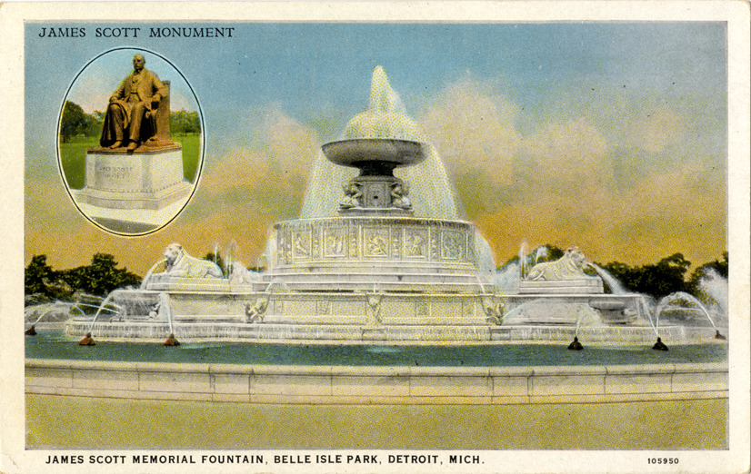 View of the James Scott Memorial Fountain on Belle Isle, with inset of James Scott Monument. Printed on front: "James Scott Memorial Fountain, Belle Isle Park, Detroit, Mich., 105950. James Scott Monument." Printed on back: "Scott Fountain, Belle Isle Park, Detroit, Mich. The James Scott Memorial Fountain in Belle Isle Park stands as a monument to James Scott, a citizen on Detroit, who died in 1910 and left the bulk of his fortune to the City. The fountain was designed by Cass Gilbert and cost $500,000, the City expending over $100,000 for reclaiming land and developing the site surrounding the fountain. A statue of the donor of magnificent proportions faces the fountain. Work on the fountain was commenced in July, 1921, and the formal dedication took place on May 31, 1925. Diameter 510 ft., height 37 ft. 9 in., height of main water column 125 ft. C.T. American art colored."