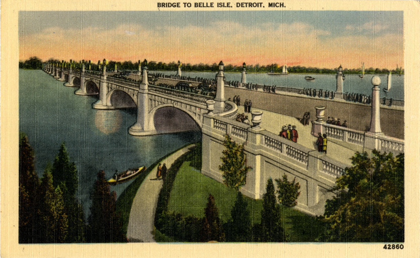 View of bridge to Belle Isle over Detroit River; pedestrians look over bridge railing at boats in river. Printed on front: "Bridge to Belle Isle, Detroit, Mich." Printed on back: "Belle Isle is in the Detroit River between Detroit and Windsor, Canada. The island contains 702 acres and is entirely covered with one of the most beautiful parks in the United States, having some 21 miles of macadam roads; a magnificent casino, pavilions, boat houses, aquarium, horticultural hall and zoological gardens. The island was purchased by Detroit in 1879, and has since then expended $1,600,000 in beautifying it. Metrocraft, Everett, Mass."