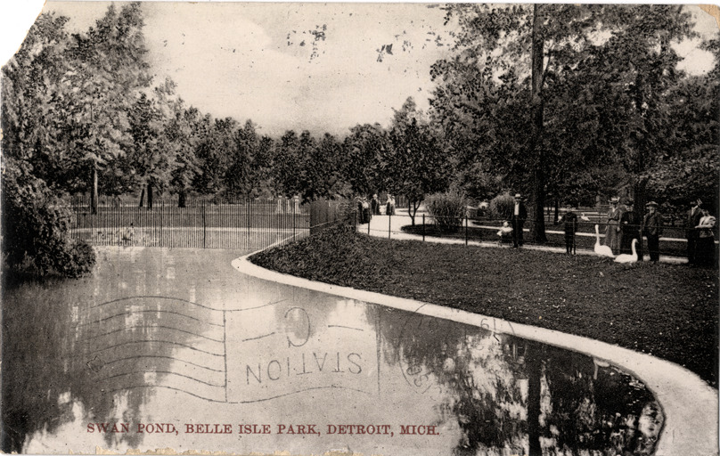 View of park visitors watching swans inside a fenced enclosure; pond in foreground. Printed on front: "Swan pond, Belle Isle Park, Detroit, Mich." Handwritten on back: "Dear Fred, Your dear letter received today will write soon. Grandma is coming home tomorrow. Matie returned from Lillies tonight, Edna's here. Mother." Card is postmarked August 28, 1907.