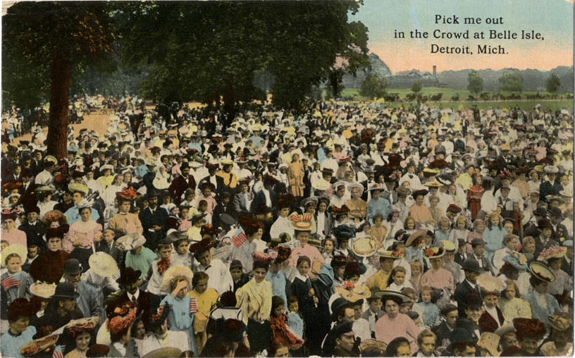 View of crowd on Belle Isle. Printed on front: "Pick me out in the crowd at Belle Isle, Detroit, Mich." Printed on back: "C.T. Photochrom." Handwritten on back: "Dear [undecipherable], we are here visiting John, having lovely time going to shows and we are going to Belle Ile today. Aunt Nellie." Card is postmarked June 28, 1914.