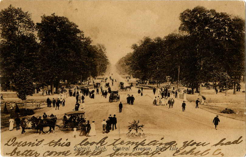 View of men, women and children walking on tree-lined Central Avenue on Belle Isle. Handwritten on front: "Doesn't this look tempting, you had better come next Sunday. Ethel C." Printed on front: "Detroit, Mich. Central Avenue, Belle Isle." Printed on back: "No. 15. A.C. Dietsche, Detroit, Mich. and Leipzig, Germany." Card is postmarked September 10, 1907.